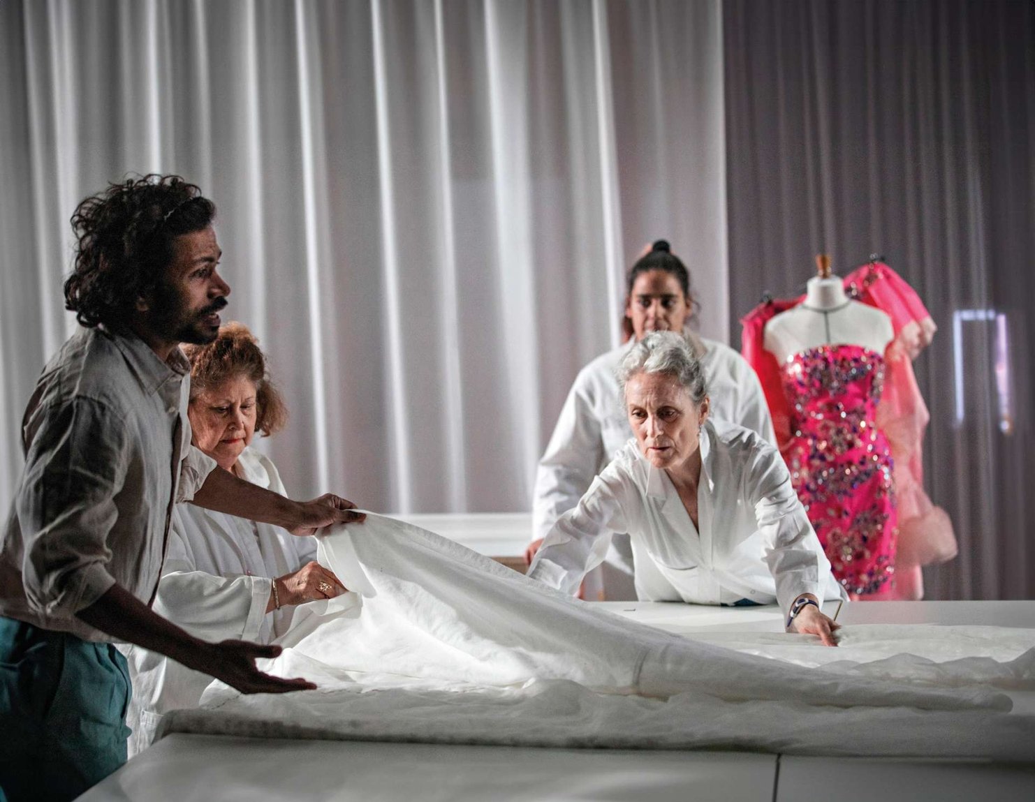 Lacrima met en avant la mission d’un atelier de haute couture parisien qui est de confectionner la robe de marier de la future princesse d’Angleterre, nous suivons également la confection du voile dans l’atelier d’Alençon. Entre Paris, Mumbai (où se trouvent des artisans relégués à de la main d’œuvre bon marché) et Alençon nous assistons aux coulisses de cette mise en œuvre d’exception soumise à un contrat de confidentialité qui ressemble à un secret d’état. A cette aubaine professionnelle sous haute tension vient se mêler l’histoire personnelle des personnages. Des questionnements interviennent dans l’esprit du spectateur sans tomber dans la binarité. Ainsi est mis en exergue les conditions de travail en Europe et en Inde, le temps de production et le poids des apparences.